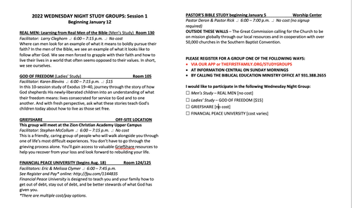 Reach out to our Biblical Education Pastor Rick Blevins to find a group with which to connect.