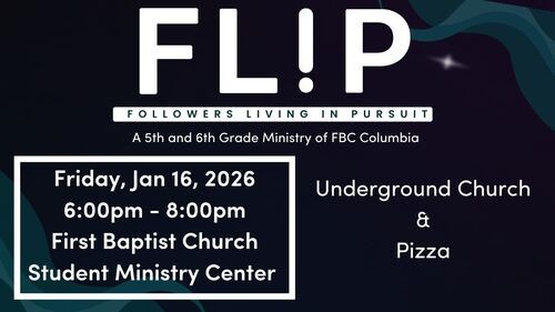 Calling all 5th & 6th Graders! We have our first FLIP Event of the New Year. Come join us on Friday, January 16th from 6:00-8:00pm in the Student Ministry Center. We will be serving pizza for dinner and playing Underground Church.
