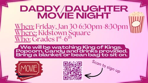 Fathers, please join us for this wonderful Elementary event, (Grades 1st-6th) on January 30th. You'll get to spend the evening with your beautiful daughter(s) watching King of Kings. There will be Popcorn, candy and drinks provided. Bring a blanket or bean bag to sit on.
