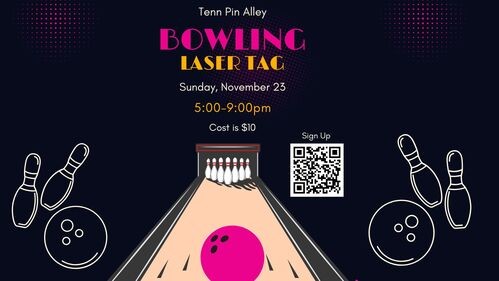 We're going to Tenn Pin for bowling and laser tag on Sunday, November 23 from 5-9pm. Cost is $10 and bring money for food and any other activity you may want to do besides bowling and laser tag. Sign up below so we know how many!