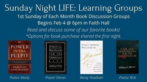 Each Sunday Night at 6:00pm in Faith Hall. Join together in reading some of our favorite books and discussing over the next few months. *Options for book purchase shared the first night.